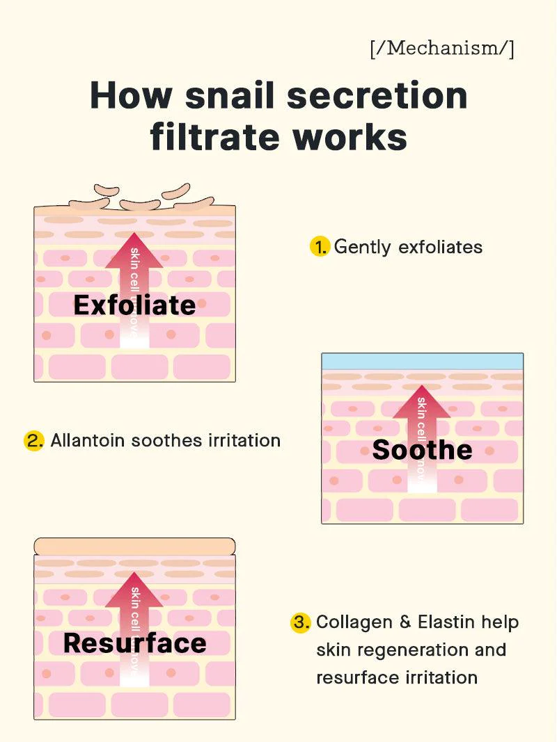 Snail Secretion Filtrate, Butylene Glycol, Glycerin, Helianthus Annuus (Sunflower) Seed Oil, 1,2-Hexanediol, Niacinamide, Water, Palmitic Acid, Arginine, Carbomer, Stearic Acid, Betaine, Cetearyl Olivate, Sorbitan Olivate, Sodium Polyacrylate, Allantoin, Tocopheryl Acetate, Panthenol, Hydroxyethyl Acrylate/Sodium Acryloyldimethyl Taurate Copolymer, Sodium Hyaluronate, Adenosine, Xanthan Gum, Myristic Acid, Copper Tripeptide-1, Acetyl Hexapeptide-8, Palmitoyl Pentapeptide-4, Palmitoyl Tripeptide-1, Palmitoyl Tetrapeptide-7